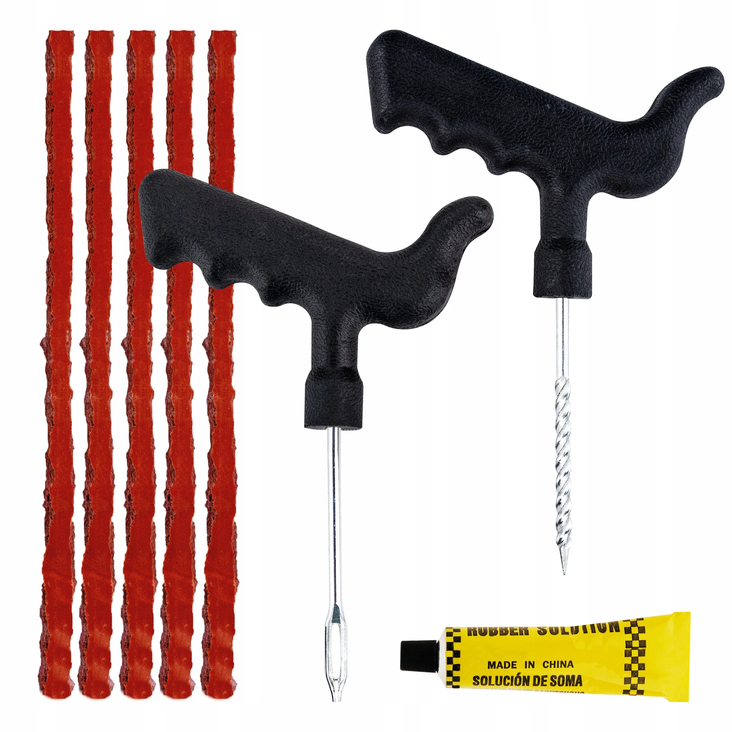 Zestaw jest zastępczy w przypadku zwykłych opon, takich jak np. przebić gwoździem lub śrubą. Zestaw składa się z 5 elementów: kleju do sznurów do uszczelniania oraz narzędzia do rozprzestrzeniania i rozpowszechniania, obcinaka i szydła . Sznury wykonane są z materiałów wysokiej jakości, które są stosowane w warunkach awaryjnych. Dołączone są aktywatorem , który przyspiesza proces przyłączania z oponą. Klej wlotowy z powietrza zaczyna twardnieć, tworząc szczelną powłokę w miejscu docelowym.